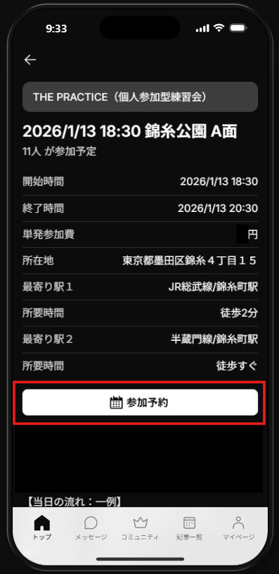イベント開催の詳細ページにて内容を確認し「参加予約」ボタンを押すと予約できます。