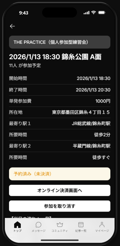 参加予約後、画面に「予約済み(未決済)」が表示されます。